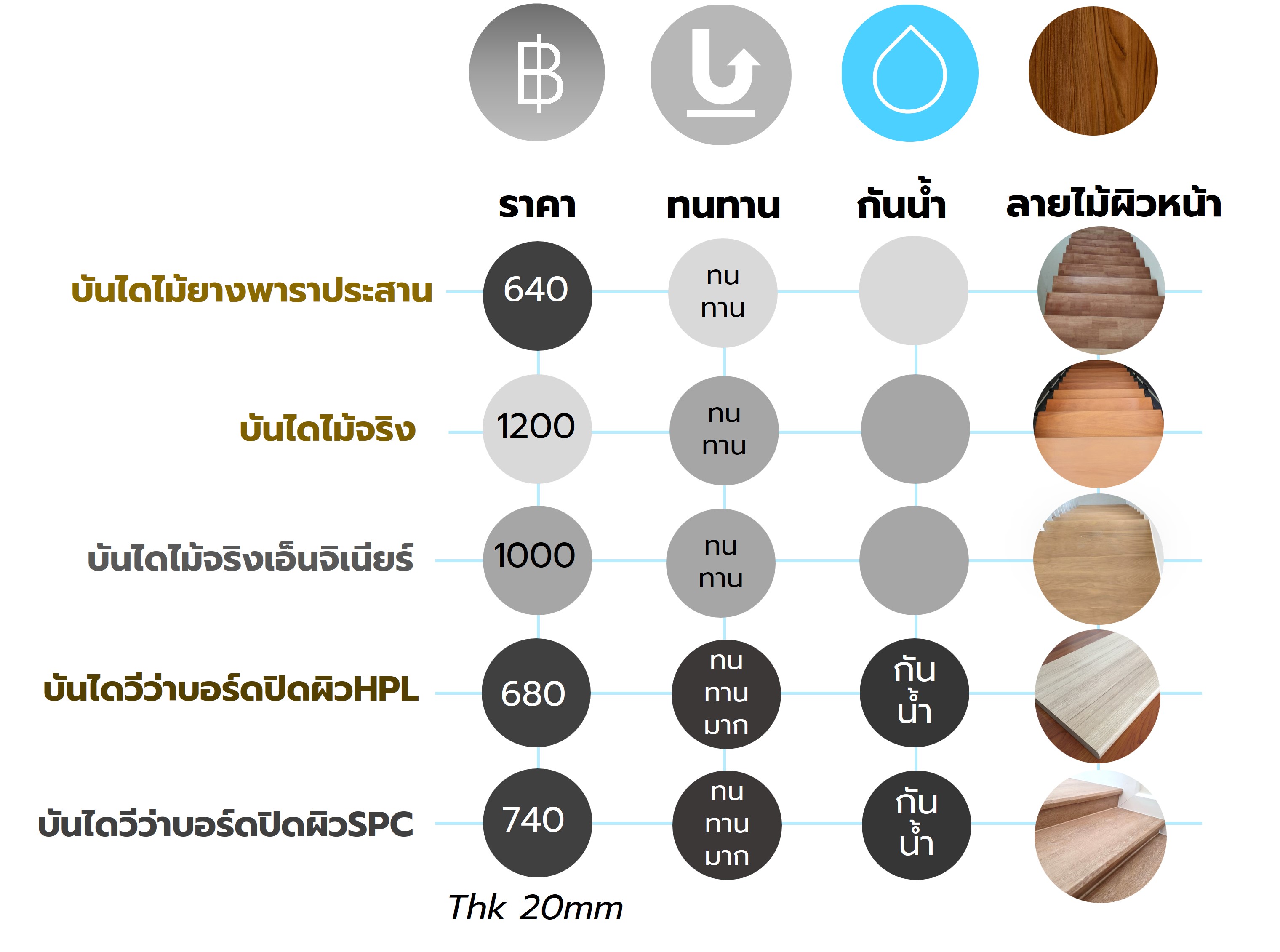 ความทนทานของตัวแผ่นไม้บันได ขั้นบันไดนั้นเป็นวัสดุที่ต้องรับแรงน้ำหนักเดินขึ้นลงรับของบุคคลและสิ่งของ ดังนั้นวัสดุที่นำมาใช้เป็นขั้นบันไดจึงต้องรับน้ำหนักและทนแรงกระแทกได้ดี