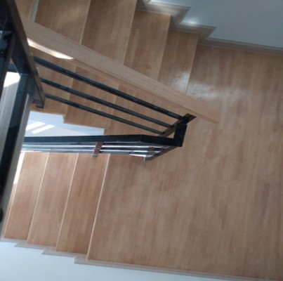 ชุดชานพักบันไดกระเบื้องยางspc ทนแรงกระแทก กันปลวกกันน้ำ100% ไม่โก่งตัว เลือกลายไม้บันไดให้เป็นลายไม้เดียวกับพื้นspcชั้นสอง ขนาดบันไดสั่งผลิตได้ตามแบบ