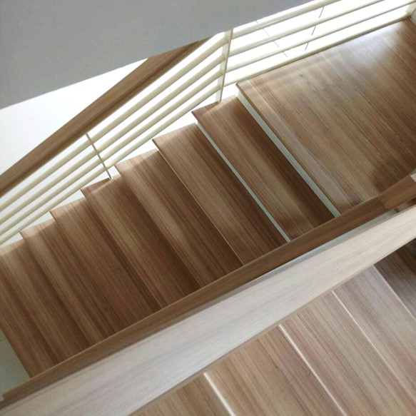 บันไดบ้านลายไม้โมเดิร์น กันปลวกไม่โก่งตัว เลือกใช้ชานพักบันไดวีว่าบอร์ดปิดผิวลามิเนตลายไม้ ความหนา 20 mm * ความกว้าง 1200 mm * ความยาว 1200 mm