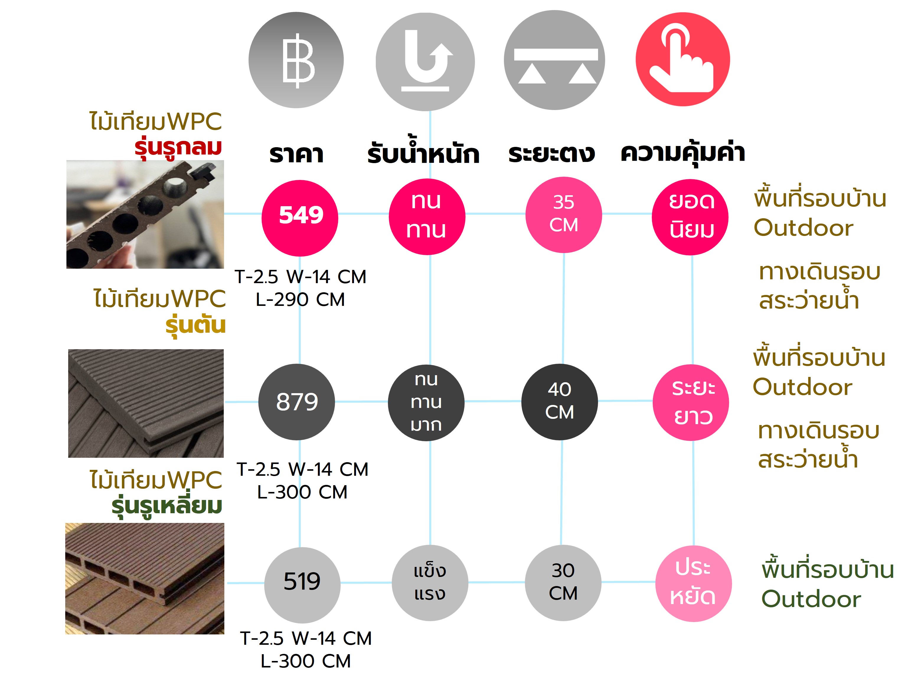 พื้นไม้เทียมwpc (Wood Plastic Composite) ตัวแผ่นพื้นไม้ทำมาจากพลาสติกผสมผงไม้ มีคุณสมบัติกันน้ำและกันปลวก 100% ความหนาตัวแผ่น 25 มิล ออกแบบให้รับแรงกระแทกได้ดี นิยมใช้กับการใช้พื้นทางเดินภายนอก,พื้นระเบียงรอบบ้าน และพื้้นรอบสระว่ายน้ำ