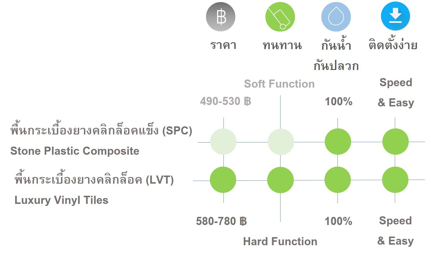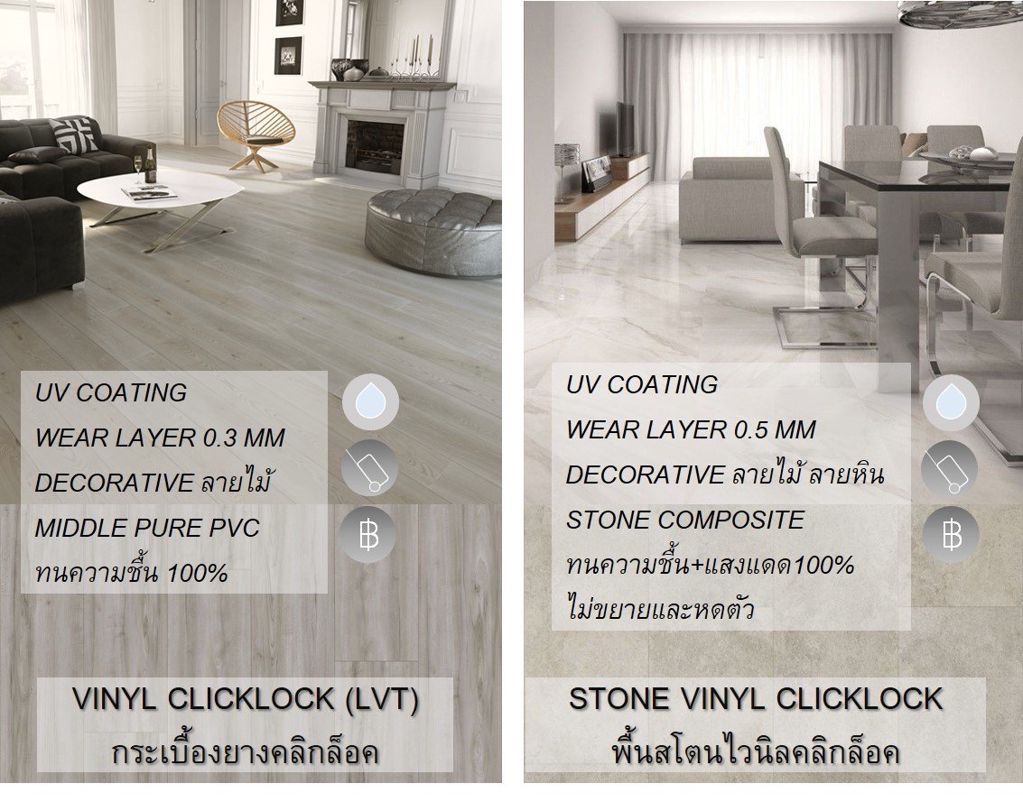 พื้นกระเบื้องยางลายไม้คลิกล็อคLVT มีการพัฒนากระบวนการผลิตให้มีราคาถูกลงโดยให้มีคุณสมบัติป้องกันน้ำ ป้องกันปลวก เรียกว่า พื้นกระเบื้องยางลายไม้คลิกล็อคSPC (Stone Plastic Composite) เรามาทำความรู้จักข้อเปรียบเทียบของพื้นกระเบื้องยางทั้งสองชนิด