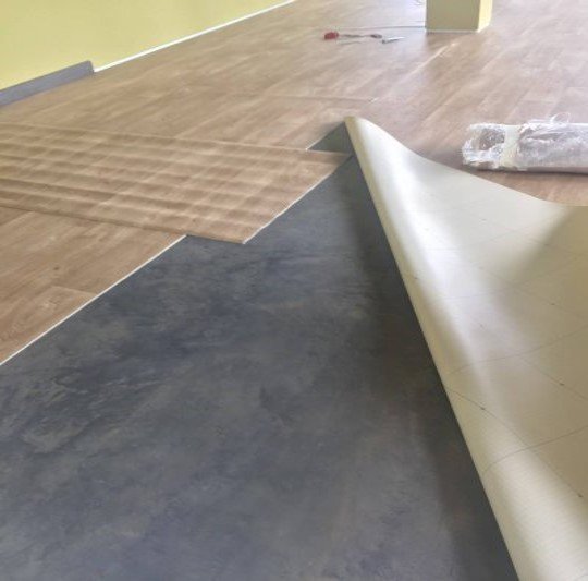 4. ติดตั้งพื้นลดแรงกระแทกทับพื้นกระเบื้องที่เป็นพื้นเดิม พื้นกระเบื้องส่วนใหญ่จะได้ระดับเพราะมีการทำระดับก่อนการติดตั้งพื้นกระเบื้อง และพื้นกระเบื้องมีค่าการป้องกันความชื้นสูง การตรวจสอบความชื้นและระดับพื้นกระเบื้องก่อนการติดตั้งจะทำได้ง่ายกว่าพื้นซิเมนต์ขัดมัน ควรเก็บรอยต่อแผ่นกระเบื้องเดิมด้วยปูนกาวหรือฟุตตี้ที่มีความแข็งแรงสูง เพื่อให้พื้นลดแรงกระแทกหลังติดตั้งเรียบสม่ำเสมอ มองไม่เห็นรอยต่อระหว่างแผ่นกระเบื้อง
