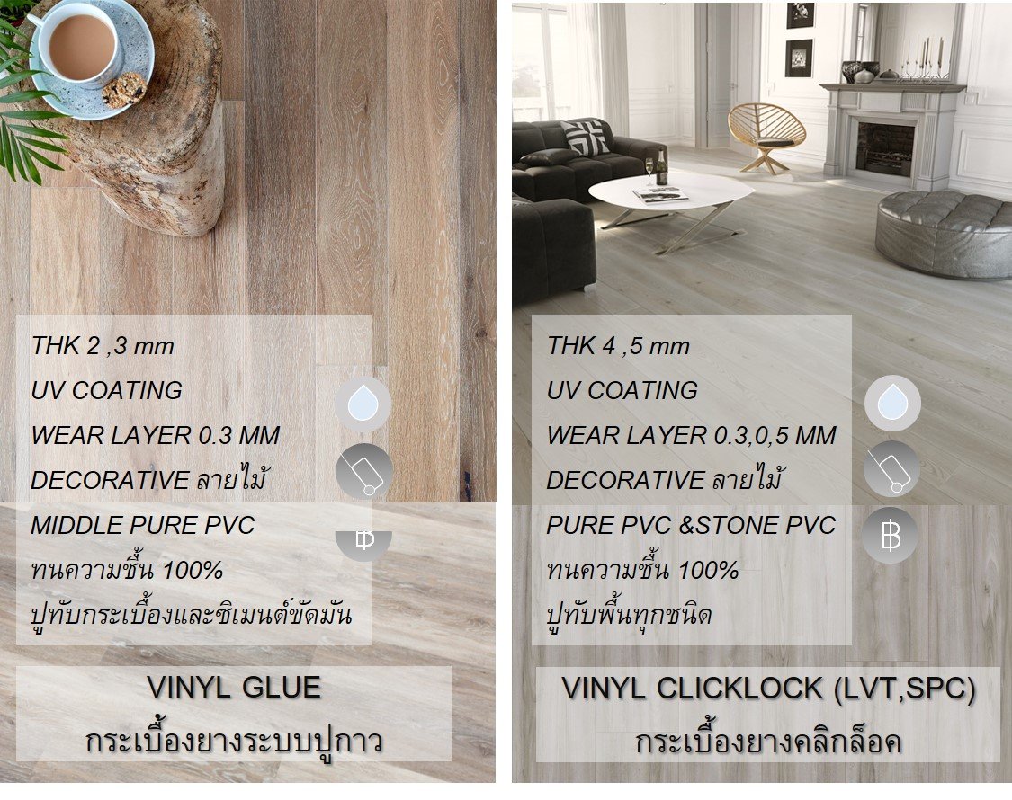 เปรียบเทียบคุณสมบัติ ของพื้นกระเบื้องยางลายไม้ระบบคลิกล็อคและพื้นกระเบื้องยางลายไม้ระบบปูกาว