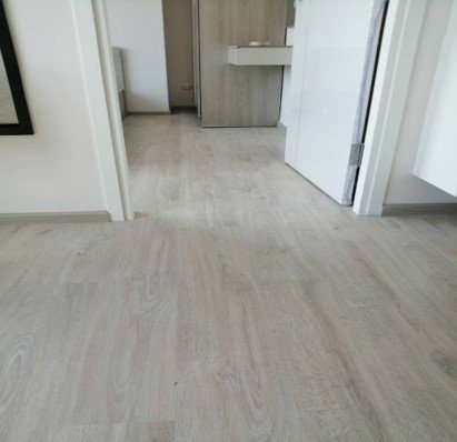 7. นำลิ่มไม้ข้างผนังที่วางไว้ออก ทำการติดบัวPVCข้างผนังรอบพื้นไม้ลามิเนต โดยปิดทับช่องว่างระหว่างพื้นไม้ลามิเนตและผนัง เก็บความเรียบร้อยด้วยแดปหรือซิลิโคนสีเดียวกับพื้นไม้ลามิเนตด้านล่างและด้านบนบัวPVC
