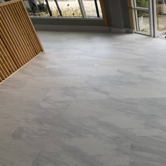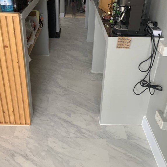 • กระเบื้องยางลายหินอ่อนสีขาวธรรมชาติ พื้นสำนักงานคลีนิคปิ่นเกล้า ปูทับพื้นเดิมที่เป็นพื้นแกรนิโตสีขาวล้วน