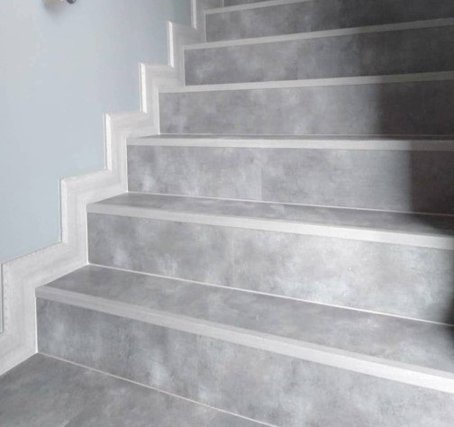 • บันไดใช้กระเบื้องยางลายหินอ่อนปูกาวยึดติดกับบันไดปูนเพื่อให้บันไดเป็นลายซิเมนต์สีเทาเดียวกับพื้นชั้นล่างและพื้นชั้นสอง ช่วยให้พื้นที่ดูกว้างขึ้น