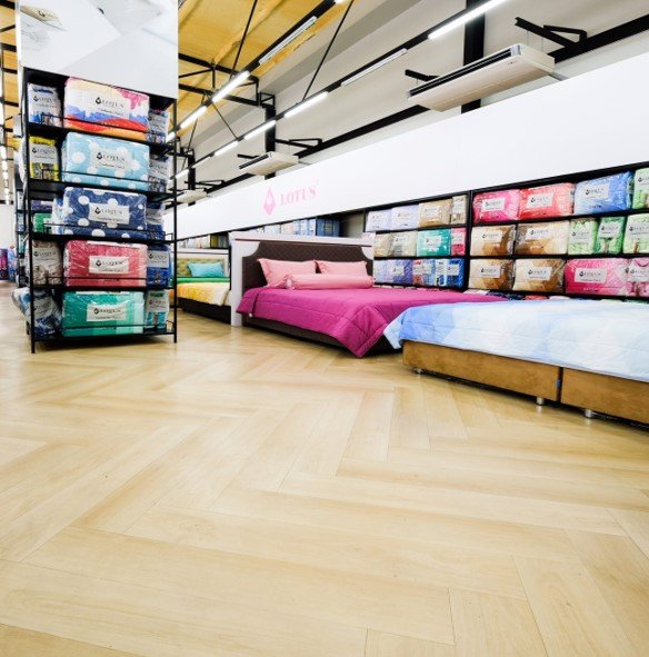 - ข้อดีของการปูกระเบื้องยางลายก้างปลาด้วยกระเบื้องยางคลิกล็อคSPC ติดตั้งรวดเร็วด้วยระบบคลิกล็อคโดยไม่ต้องติดกาว การรื้อแผ่นกระเบื้องยางเพื่อซ่อมแซมทำได้ง่ายโดยไม่กระทบพื้นชั้นล่าง กระเบื้องยางลายก้างปลาแบบคลิกล็อคตัวแผ่นเป็นกระเบื้องยางSPC(Stone Plastic Composite)ตัวแผ่นไม่ขยายและหดตัวเมื่ออุณหภูมิเปลี่ยนแปลง มีความแข็งแรง