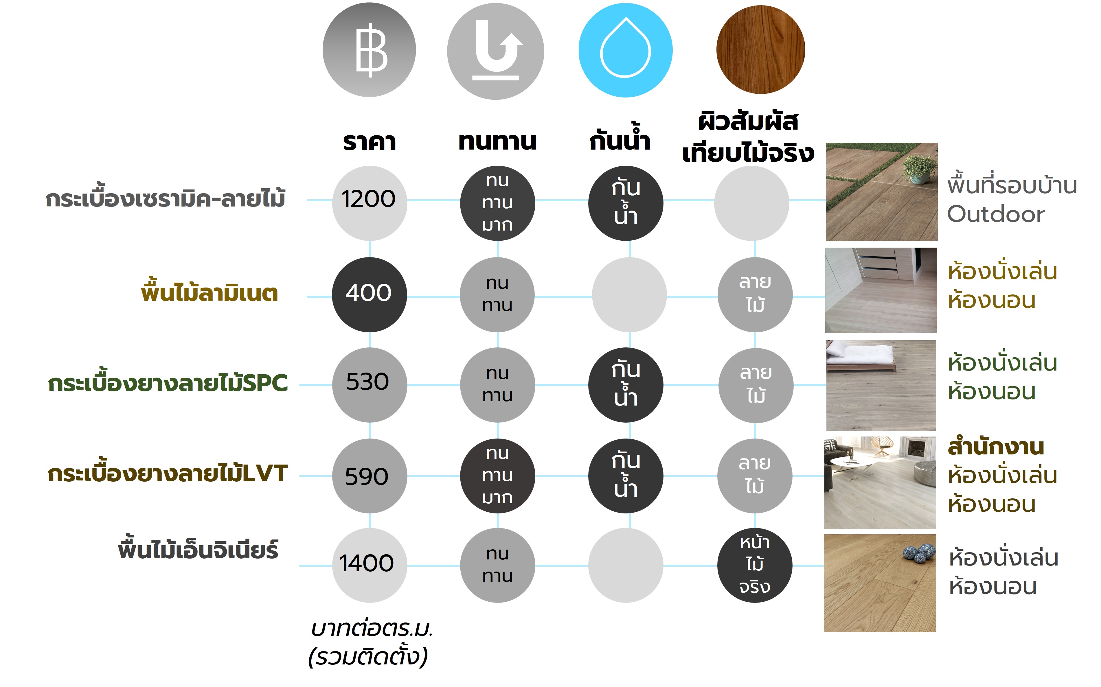 ตารางเปรียบเทียบข้อดีและคุณสมบัติของกระเบื้องยางลายไม้5ชนิด