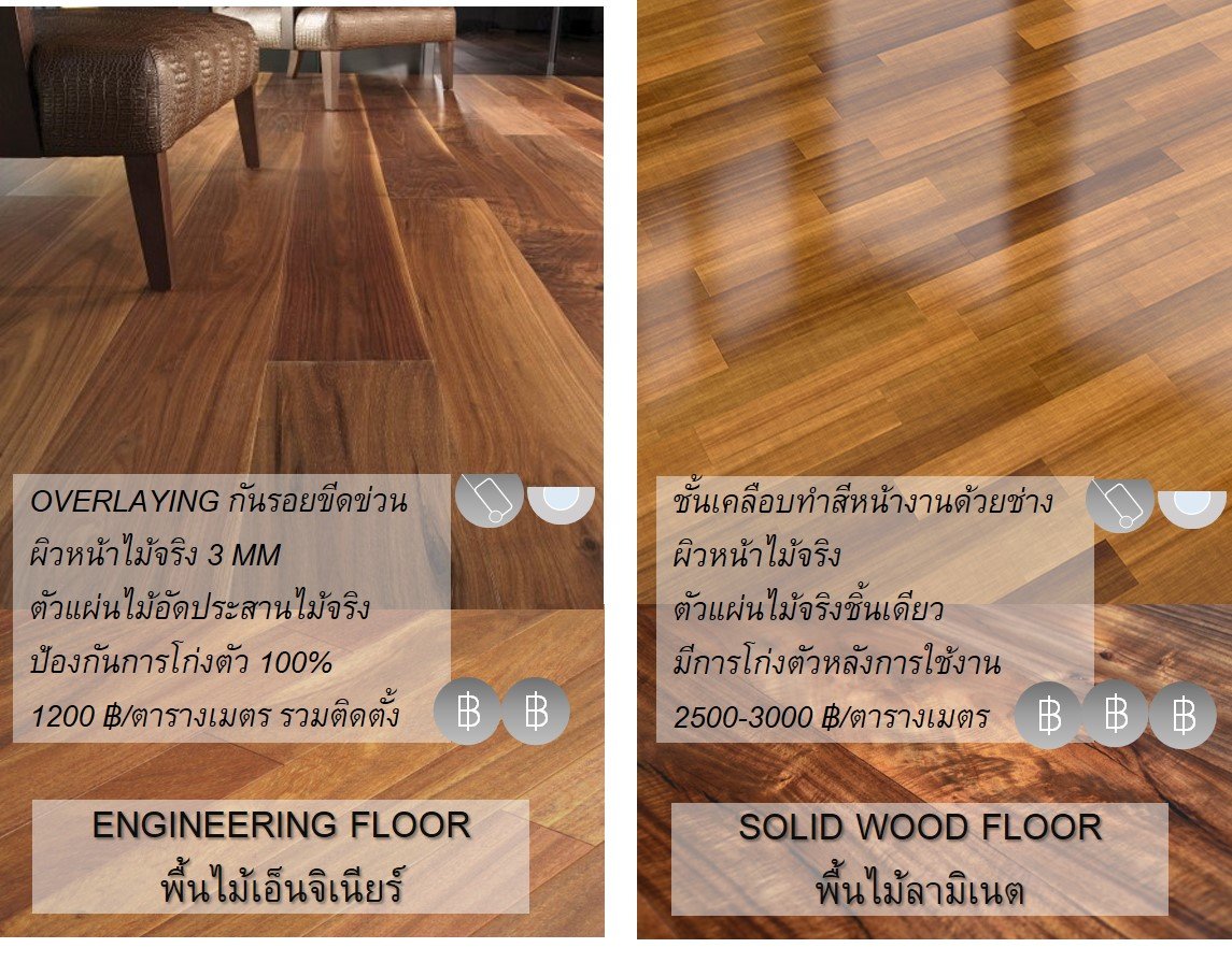 - เปรียบเทียบด้านราคา พื้นไม้เอ็นจิเนียร์มีราคาประมาณ 1380-1800 บาทต่อตารางเมตรรวมติดตั้ง ขึ้นกับชนิดไม้ ซึ่งมีราคาถูกกว่าพื้นไม้จริงทั้งชิ้น 2500-3500 บาทต่อตารางเมตร